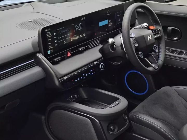 Hyundai Ioniq 5 N có nội thất tương tự bản thường, nhưng được bổ sung một số phím chức năng phục vụ việc lái xe thể thao, giao diện màn hình được tinh chỉnh lại, ghế thể thao và vô lăng mới.